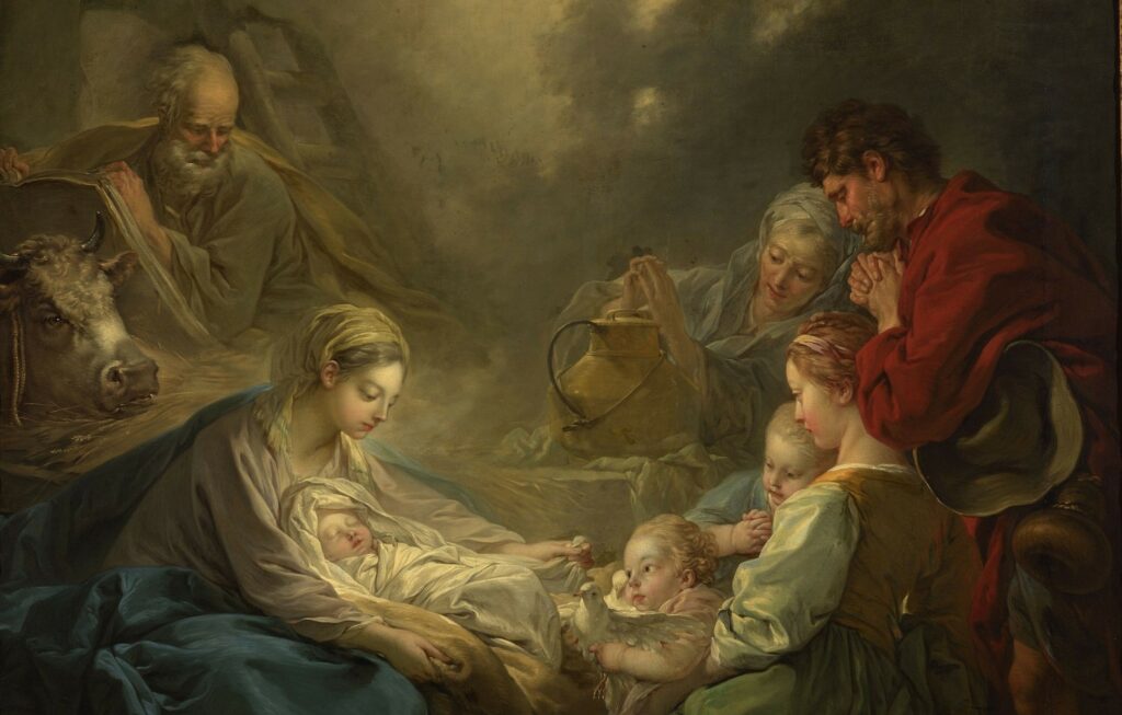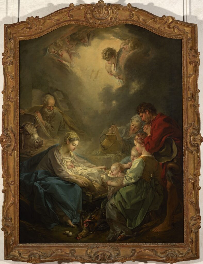 Le tableau2 qui nous intéresse aujourd’hui transmet immédiatement un sens religieux profond : nous nous sentons irradiés de la lumière qui provient de l’Enfant Jésus, et les personnages qui l’entourent nous entraînent dans leur émerveillement pour tant de tendresse et de simplicité. Pourtant, les deux personnes qui sont à l’origine de cette toile ne sont pas vraiment religieuses, et leurs vies personnelles ne se calquent pas sur l’idéal chrétien. Ils ressemblent un peu à Sonia et Raskolnikov, et lisent ensemble l’Évangile… Ils s’appellent François Boucher et Madame de Pompadour.